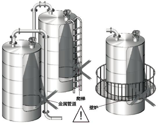 ◆外罐壁為GRP之類的非導(dǎo)電材料塑料罐用雷達(dá)液位計(jì)測(cè)量液位時(shí),雷達(dá)液位計(jì)微波信號(hào)同樣會(huì)被信號(hào)波束角外的干擾物(比如金屬管道、爬梯、壁爐)反射回來(lái)。因此在雷達(dá)液位計(jì)信號(hào)波束角內(nèi)不能安裝此類干擾物。