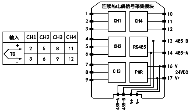 連續熱電偶信號采集模塊YR-9740A接線圖