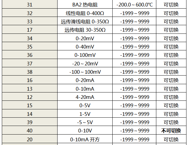 1、全切換是指用戶可根據(jù)需求任意設(shè)置輸入分度號表格中的信號類型