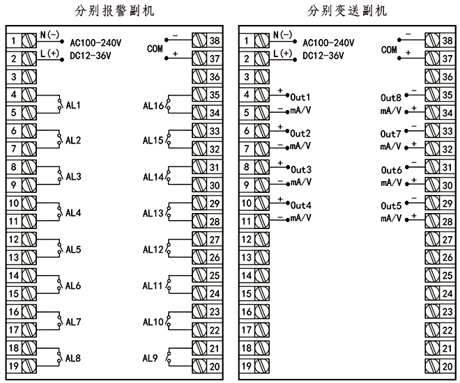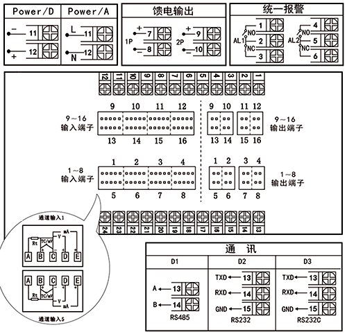 [2]:繼電器分別報警輸出(八路巡檢儀每1路輸入對應2限報警,16路巡檢儀每路輸入對應1個報警)