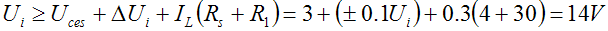 當(dāng)輸入電壓最低,而輸出電壓最高時,調(diào)整管兩端電壓Uce最低,如用晶體管作放大器,則工作電壓Uce必須高于該管的飽和電壓Uces。,放大器才能正常工作。從手冊知晶體管的Uces值均小于3V。這時可用下式來計(jì)算: