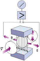 電磁流量計測量原理是基于法拉第電磁感應定律。流量計的測量管是內襯絕緣材料的非導磁合金短管。兩只電極沿管徑方向穿通管壁固定在測量管上。其電極頭與襯里內表面基本齊平。勵磁線圈由雙方波脈沖勵磁時,將在與測量管軸線垂直的方向上產生一磁通量密度為B的工作磁場。此時,如果具有一定電導率的流體流經測量管,將切割磁力線感應出電動勢E。電動勢E正比于磁通量密度B、測量管內徑d與平均流速U的乘積。電動勢E(流量信號)由電極檢出并通過電纜送至轉換器。轉換器將流量信號放大處理后,可顯示流體流量,并能輸出脈沖,模擬電流等信號,用于流量的控制和調節。