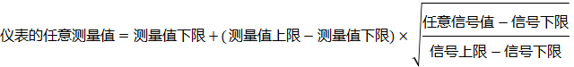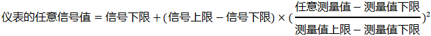 儀表的任意測(cè)量值=測(cè)量下限+(測(cè)量上限-測(cè)量下限)×[(任意信號(hào)值-信號(hào)下限)÷(信號(hào)上限-信號(hào)下限)]=0+(200-0)×[(16-4)÷(20-4)]^2=150℃