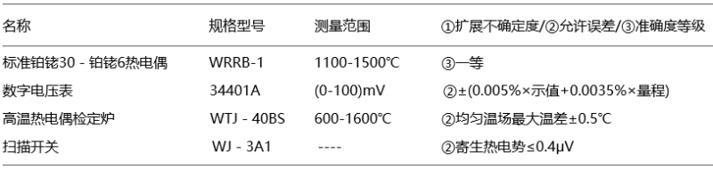 2、標(biāo)準(zhǔn)器和配套設(shè)備鉑銠30-鉑銠6熱電偶檢定所需的標(biāo)準(zhǔn)器和配套設(shè)備相關(guān)信息如下表3所示: