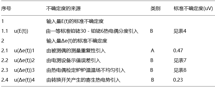 5.2.1 由被測(cè)標(biāo)準(zhǔn)鉑銠30-鉑銠6熱電偶的測(cè)量重復(fù)性引入的標(biāo)準(zhǔn)不確定度分量u(Δ(et))1(A類);