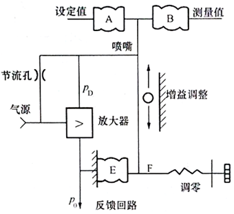 一個(gè)假想的氣動(dòng)比例調(diào)節(jié)器原理如圖1所示。誤差的檢測由波紋管A和B來實(shí)現(xiàn),測量值或設(shè)定值的任何變化都將導(dǎo)致?lián)醢宓囊苿?dòng),經(jīng)噴嘴擋板機(jī)構(gòu)放大后,至功率放大器再進(jìn)行功率放大,其輸出P0又經(jīng)反饋波紋管E和驅(qū)動(dòng)桿F作用于擋板,最后使調(diào)節(jié)器輸出P0穩(wěn)定在某一值,并實(shí)現(xiàn)與測量值和設(shè)定值之差成比例。氣動(dòng)調(diào)節(jié)器的比例增益可通過改變增益調(diào)整球的上下位置進(jìn)行整定,氣動(dòng)調(diào)節(jié)器的輸出零點(diǎn)可通過調(diào)零彈簧進(jìn)行調(diào)整,氣動(dòng)調(diào)節(jié)器正作用、反作用可通過改變測量信號和設(shè)定值信號輸入波紋管A和B的方法來實(shí)現(xiàn)。在圖中,測量信號進(jìn)入波紋管B,設(shè)定信號進(jìn)入波紋管A,氣動(dòng)調(diào)節(jié)器是正作用如果改為測量信號進(jìn)入A,設(shè)定信號進(jìn)入B,則變?yōu)榉醋饔谩?/span>