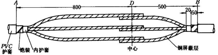 3、剝除電纜護套及布(或紙帶)。按圖數值剝切并切斷電纜護套,布帶和黃麻不要切斷,將其卷回到電纜根部作為備用。