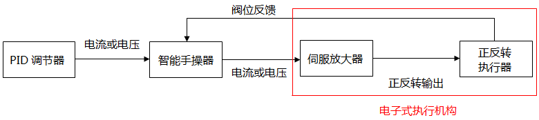 來(lái)自電動(dòng)執(zhí)行器外部的控制信號(hào)(控制信號(hào)為PID調(diào)節(jié)器或手操器的電流輸出)接入伺服放大器,再由伺服放大器將控制信號(hào)轉(zhuǎn)換為正轉(zhuǎn)/反轉(zhuǎn)開(kāi)關(guān)量輸出控制正反轉(zhuǎn)執(zhí)行器電機(jī)后輸出位移推力(直行程)或轉(zhuǎn)角力矩(角行程),驅(qū)動(dòng)閥門動(dòng)作。不難看出,伺服放大器是介于控制信號(hào)和執(zhí)行器電機(jī)之間的中間裝置,伺服放大器可獨(dú)立存在,也可以和執(zhí)行機(jī)構(gòu)集成在一起或?qū)⑹植倨髋c伺服放大器集成在一起。