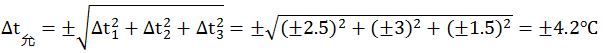 4、被檢短偶測溫裝置的允許基本誤差,按下式計算: