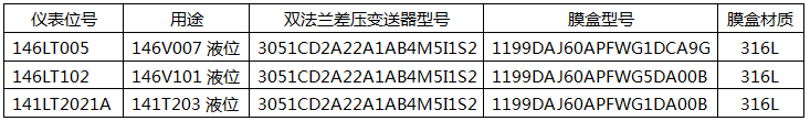 根據(jù)凈化裝置變換部分的合成氣和凝液的的成份組成(有CL-、S+、H+及灰份固體顆粒)和雙法蘭差壓變送器的選型原則,測(cè)量氯腐蝕、硫腐蝕、氫脆工況應(yīng)選用316L加厚鍍金的雙法蘭差壓變送器。測(cè)量?jī)艋b置H2S濃縮塔141T203的塔底液位141LT2021A與介質(zhì)接觸的隔離膜片的材質(zhì)可以是純金屬鉭。