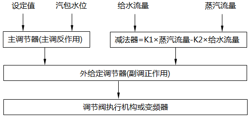 從圖1知,汽包水位調節器的輸出信號作為外給定調節器控制信號、蒸汽流量信號、給水流量信號(負信號)一同送進減法器進行運算,減法器的輸出作為外給定調節器測量信號,外給定調節器輸出控制調節閥的開度。