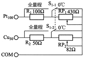 S1是一個KN型的雙極雙位鈕子開關.當S1開關在“0℃”位置時,它把兩只電位器都短接了,這時從Pt100端與COM端輸出的電阻值為100Ω,對應溫度為0℃。從Cu50端與COM端輸出的電阻值為50Ω,對應溫度為0℃??捎脕頇z查熱電阻輸入的數顯表的0℃點顯示是否正常。