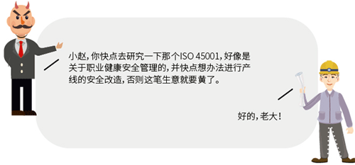 BOSS:小趙,你快點(diǎn)去研究一下那個ISO45001,好像是關(guān)于職業(yè)健康安全管理的,并快點(diǎn)想辦法進(jìn)行產(chǎn)線的安全改造,否則這筆生意就要黃了。