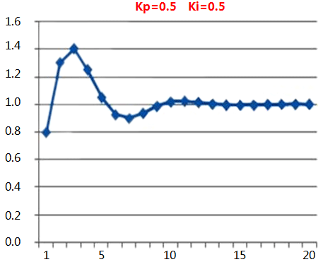 我們發現對比上面那張Kp=0.5,Ki=0.5 的圖,這張圖的震蕩減輕了,這正是微分發生了作用,