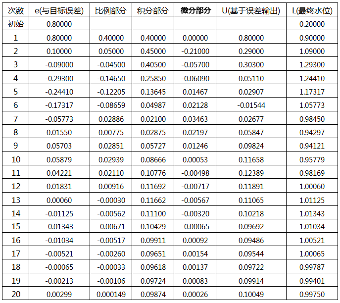 第一次加水:誤差為0.8,比例部分Kp×0.8=0.4m, 積分部分 Ki×[e(1)]=0.24m,加入水量u為0.4+0.24=0.64m,最終水位0.2+0.64-0.1=0.74m