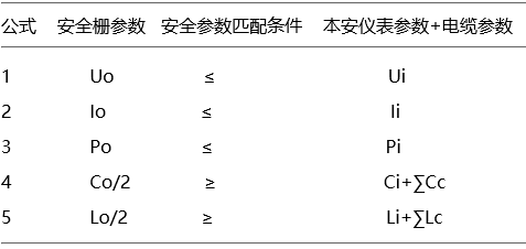 安全柵、本安儀表、電纜的安全參數(shù)匹配,要滿足表1中的5個(gè)不等式: