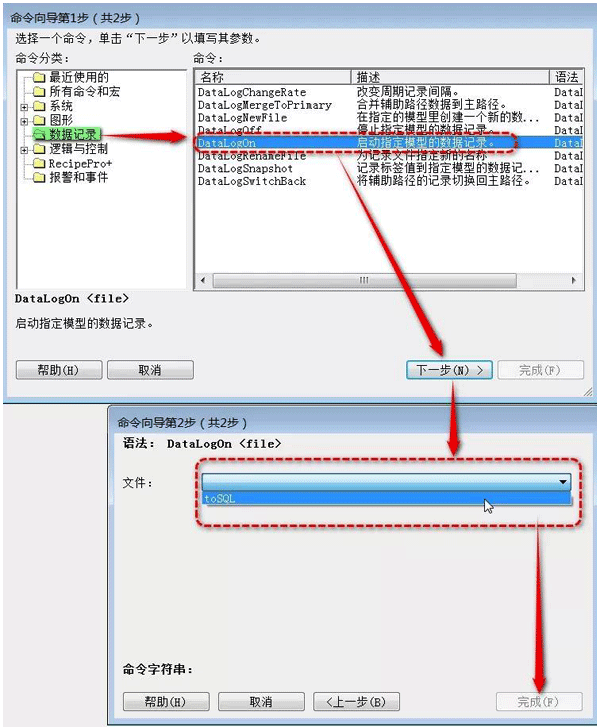 19、用鼠標(biāo)在命令行窗口內(nèi)雙擊,彈出命令向?qū)?,找到啟?dòng)數(shù)據(jù)記錄模型命令DataLogOn,并指定文件toSQL,點(diǎn)完成按鈕。
