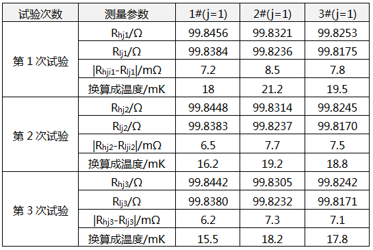 使用三支鉑絲型鉑電阻溫度計按照以上方法進行熱遲滯性試驗,測得三次在0℃的熱遲滯性數據,分別為:|Rhj1-Rlj1|、|Rhj2-Rlj2|和|Rhj3-Rlj3|。
