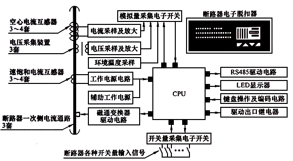 圖3中,電流,電壓等模擬量通過模擬量采集電子開關(guān)輸入到CPU中,CPU對模擬量采集電子開關(guān)發(fā)出選通控制實現(xiàn)高速循環(huán)輸入各種模擬量;斷路器的各種開關(guān)量則從開關(guān)量采集電子開關(guān)輸入CPU。CPU的輸出包括:LED顯示器顯示測控信息和模擬量信息,鍵盤操作及編碼電路用于實現(xiàn)人機(jī)對話,驅(qū)動出口繼電器則用于執(zhí)行各種脫扣操作,而RS485驅(qū)動電路則用于與上位系統(tǒng)交換信息。