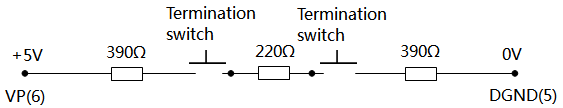Profibus的連接器上除了有一個220歐姆(Ω)的終端電阻外,還包括一個390歐姆(Ω)的上拉電阻和一個390歐姆(Ω)的下拉電阻。其中,上拉電阻(390Ω)與針腳6(VP,+5V)相連接,下拉電阻(390Ω)與針腳5(GND,0V)相連接,終端電阻(220Ω)通過總線連接器的開關(guān)與其它兩個電阻相連,如下圖: