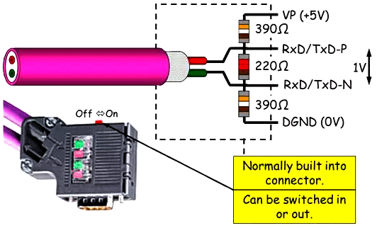 當(dāng)打開連接器的終端電阻開關(guān)(撥到ON檔)后,Profibus的A、B兩條數(shù)據(jù)線將于220歐姆(Ω)的終端電阻相連,如下圖: