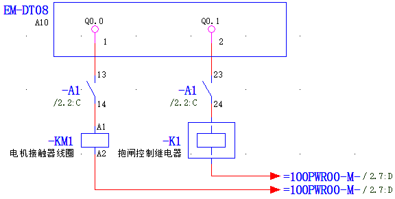 其中:輸出通道Q0.0接到PNOZ s5的常開觸點S13/S14,再連接到電機接觸器KM1的線圈;輸出通道Q0.1連接到PNOZ s5的常開觸點S23/S24,連接到中間繼電器K1的線圈;中間繼電器K1用于控制電機抱閘(AC 220V),如下圖所示: