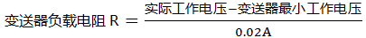 在設(shè)計(jì)系統(tǒng)時(shí),必須要了解變送器的工作電壓范圍。當(dāng)變送器的最小工作電壓比較高,又需要帶較大的負(fù)載,當(dāng)24VDC供電變送器無(wú)法正常工作時(shí),可以提高工作電壓來(lái)解決。總上所述,兩線制變送器的負(fù)載能力與變送器實(shí)際最小工作電壓有關(guān),其負(fù)載電阻計(jì)算公式如下: