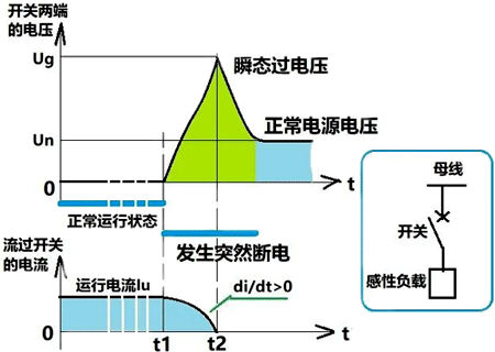 注意1:隨著負(fù)載電流(實(shí)際上就是電弧電流)不斷減小,電流對時(shí)間的變化率反而越來越大,并且在接近于 t2 時(shí)刻,電流對時(shí)間的變化率di/dt達(dá)到最大值,電感的反向電動勢電壓也達(dá)到最大值,我們把它叫做過電壓。