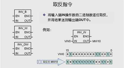 S7-200 SMART邏輯運算指令按照操作類型可以分為四種:取反指令、邏輯與指令、邏輯或指令和邏輯異或指令。如下圖所示,四列對應四種操作類型: