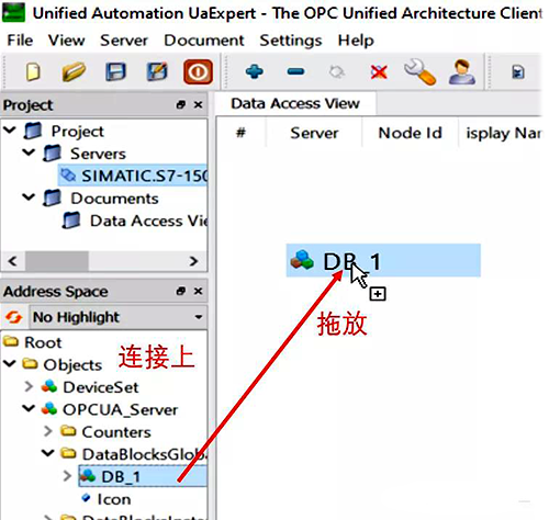 Step 6: OPC UA服務器已連接上,并顯示在AddressSpace中。找到DB_1并將其拖放入右側的Data Access View中。