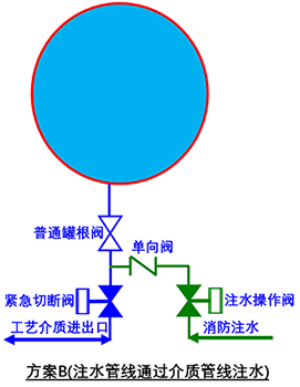 方案A:注水管線采用獨立的一根管線,直接和儲罐連接,管線上設置罐根閥+單向閥+注水操作閥(可遠程操作),其中罐根閥常開,注水操作閥常關。方案A的優勢在于注水線不受工藝介質管線的影響,注的消防水能直接通到罐內,并且注水線的管道尺寸和壓力等級可以單獨設計,注水量能得到保證。方案A的劣勢在于,在球罐上多了一個開孔,并且相連接的管線閥門法蘭都成了潛在的泄漏源。