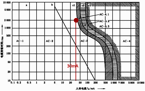 圖1為IEC 60479-1:2018“Effects of current on human beings and livestock-Part 1 :General aspects”,即電流對(duì)人和家畜的效應(yīng) 第1部分:通用部分。理論上,AC-1、AC-2、AC-3區(qū)相對(duì)安全,但是,該圖是通過人體、動(dòng)物、尸體試驗(yàn)得出的,反映的是概率,且以歐美人為主進(jìn)行的試驗(yàn),是否完全適合東亞人,不敢斷言(因?yàn)槲覀儧]有類似的試驗(yàn)研究)。因此,采用30mA上限值相對(duì)比較安全。
