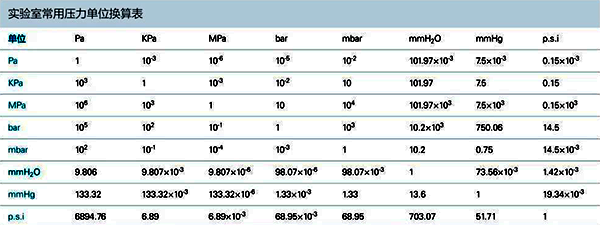 他們Pa, kPa, MPa, mbar, bar, mmH2O, Psi之間的壓力換算方式如下表: