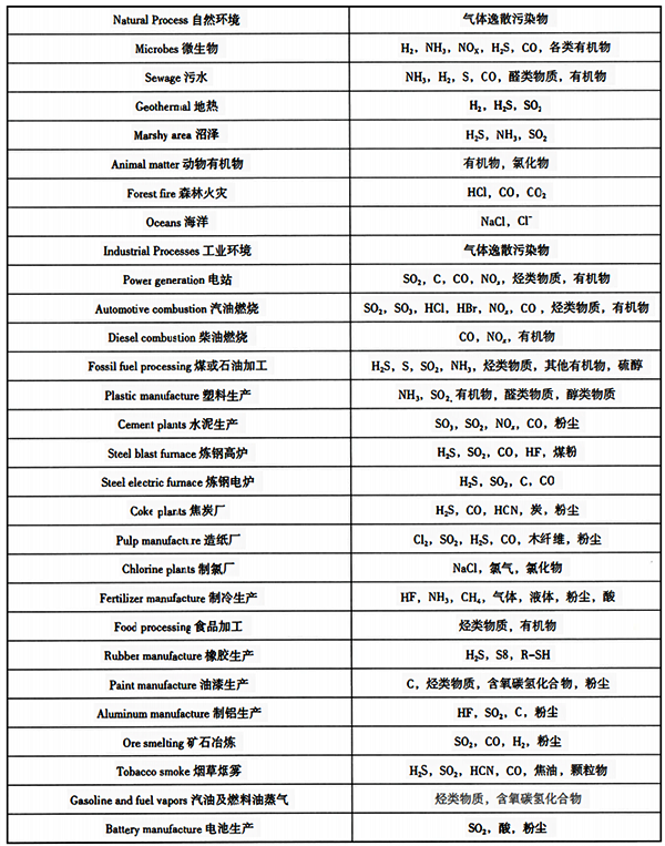 表21 自然環(huán)境及工業(yè)環(huán)境中常見的氣體污染物