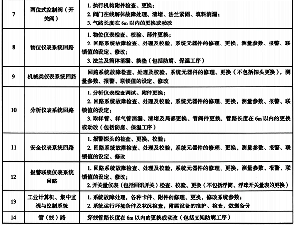 故障處理指自動(dòng)化控制與儀表各種故障原因查找和處理工作(如設(shè)備、管路密封點(diǎn)出現(xiàn)跑、冒、滴、漏等故障)。故障處理工作范圍與原定額對比,取消了溫度儀表法蘭消漏、節(jié)流裝置消漏、機(jī)械量儀表探頭更換三類故障,單列開關(guān)閥法蘭消漏、氣缸更換故障項(xiàng)目。故障處理的工作內(nèi)容見表1。