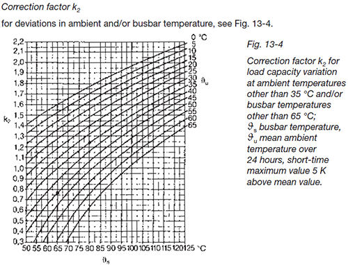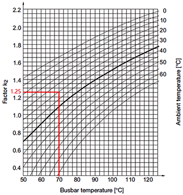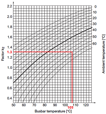 表格中橫軸為銅排允許溫度,曲線簇為環境溫度,縱軸為換算系數K2,如果環溫35℃、銅排允許溫度是65℃,則系數K2=1。
