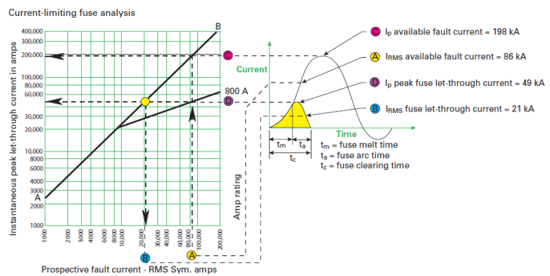 經(jīng)過(guò)斷路器或熔斷器“限流”后的截?cái)?允通)電流為49kA左右(D點(diǎn)),轉(zhuǎn)換成截?cái)?允通)電流有效值大概為21kA(B點(diǎn))。
