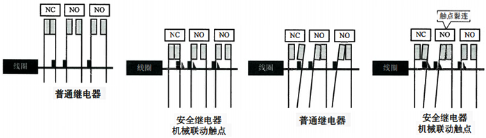 由于安全繼電器的觸點被機械性地連在一起,如果常開的安全觸點NO粘連,輔助常閉觸點NC將打開;類似的情況,如果輔助常閉觸點NC粘連,常開安全觸點NO將不能閉合。
