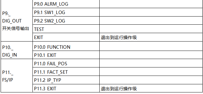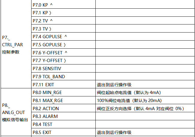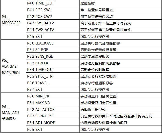 有些項(xiàng)中又可分若干分項(xiàng)以供選擇,如P1.0中可選擇LINEAR用于直行程執(zhí)行器,選擇ROTORY用于角行程執(zhí)行器。又如P1.4 EXIT中可選擇NV_SAVE(Non-Volatile save)存盤退出或CANCEL不存盤退出。