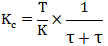 公式得到比例增益Kc=0.5,由圖1可以發(fā)現(xiàn)其設(shè)定值階躍響應(yīng)曲線還是有衰減振蕩,這說明上面的比例增益計算公式還是太強了。根據(jù)前面的試驗我們還知道設(shè)定值階躍響應(yīng)振蕩和被控對象的純滯后時間直接相關(guān)。基于上面的考慮,自衡對象的純比例控制器整定公式更新為: