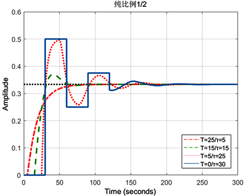 在一個由增益K、時間常數T和純滯后時間τ確定的一階純滯后過程中,獲得等幅振蕩的純比例與增益K成反比,與T/τ成正比。如下圖所示,同樣的純比例1/2,隨著T/τ從5到0閉環響應從無超調,到有超調不振蕩再到衰減振蕩。