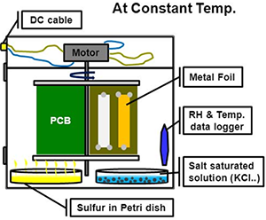 2、240小時(shí)極限電壓電流通電60℃20rpm80%RH氯化鉀飽和水溶液的濕硫黃蒸汽實(shí)驗(yàn):該實(shí)驗(yàn)多外發(fā)第三方進(jìn)行,實(shí)驗(yàn)過(guò)程或?qū)嶒?yàn)后確認(rèn)功能是否正常以及CCD觀察PCB過(guò)孔及焊盤(pán)引腳處有無(wú)腐蝕或樹(shù)枝狀離子遷移的現(xiàn)象。