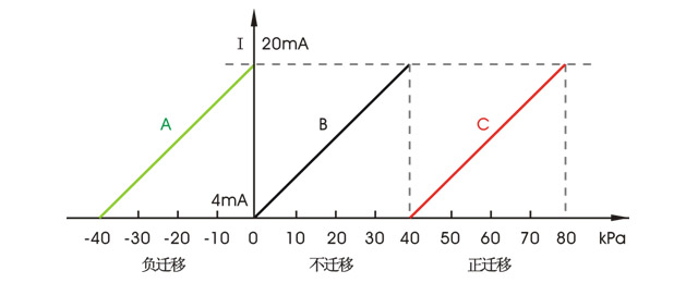 變送器的測(cè)量范圍等于量程和遷移量之和,即測(cè)量范圍=量程范圍+遷移量。如圖所示,圖中A量程為40kPa,遷移量為-40kPa,測(cè)量范圍為-40~0kPa;B量程為40kPa,無遷移量,測(cè)量范圍為0-40kPa;C量程為40kPa,遷移量為40kPa,測(cè)量范圍為40-80kPa。