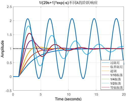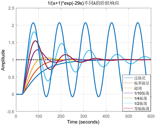 如果被控對象是一個τ/T=29/1的純滯后主導對象使用不同λ的閉環(huán)階躍響應見下圖。選擇不同λ可以實現(xiàn)從過阻尼到等幅振蕩的所有閉環(huán)響應。