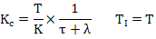 一階純滯后自衡對象使用三參數(shù)描述:穩(wěn)態(tài)增益 K,動態(tài)時間 T,純滯后時間 τ。相應的Lambda整定公式: