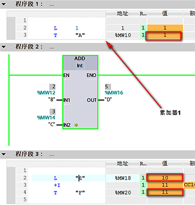 相同的程序,但是變量F的值卻等于11了,這里可以看到,在執(zhí)行程序段1時(shí),將1裝載到累加器1中,然后再傳送到變量A中。執(zhí)行程序段2后,累計(jì)器1中的值未受到影響,然后與程序段3中的變量E相加,結(jié)果輸出到變量F中,E等于10, 所以F就等于11了。