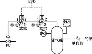 某些因誤停車而引起較大經(jīng)濟損失的工藝過程,可以采用雙電磁閥配置實現(xiàn)切斷閥電磁閥信號線路的冗余配置,以減少因電纜斷線引起的誤停車。氣路的設(shè)計原則有以下幾方面。