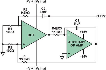 作為積分器的輔助放大器在直流時配置為開環(最高增益),但其輸入電阻和反饋電容將其帶寬限制為幾Hz。這意味著,DUT輸出端的直流電壓被輔助放大器以最高增益放大,并通過一個1000:1衰減器施加于DUT的同相輸入端。負反饋將DUT輸出驅動至地電位。(事實上,實際電壓是輔助放大器的失調電壓,更精確地說是該失調電壓加上輔助放大器的偏置電流在100kΩ電阻上引起的壓降,但它非常接近地電位,因此無關緊要,特別是考慮到測量期間此點的電壓變化不大可能超過幾mV)