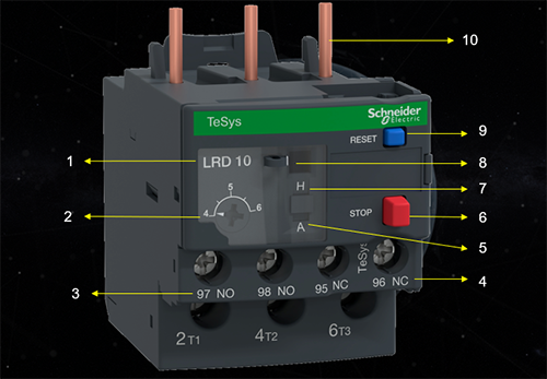 10-插接端子,LRD熱繼電器可以直接安裝在施耐德LC1D接觸器的出線端。