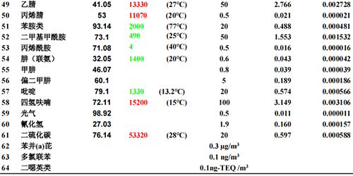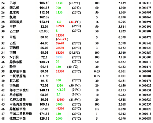 紅色數(shù)值是常溫下飽和蒸汽壓大于10000Pa,小于101325Pa,易揮發(fā)液體物質(zhì),從0.05mg/m3~100 mg/m3排放限值。